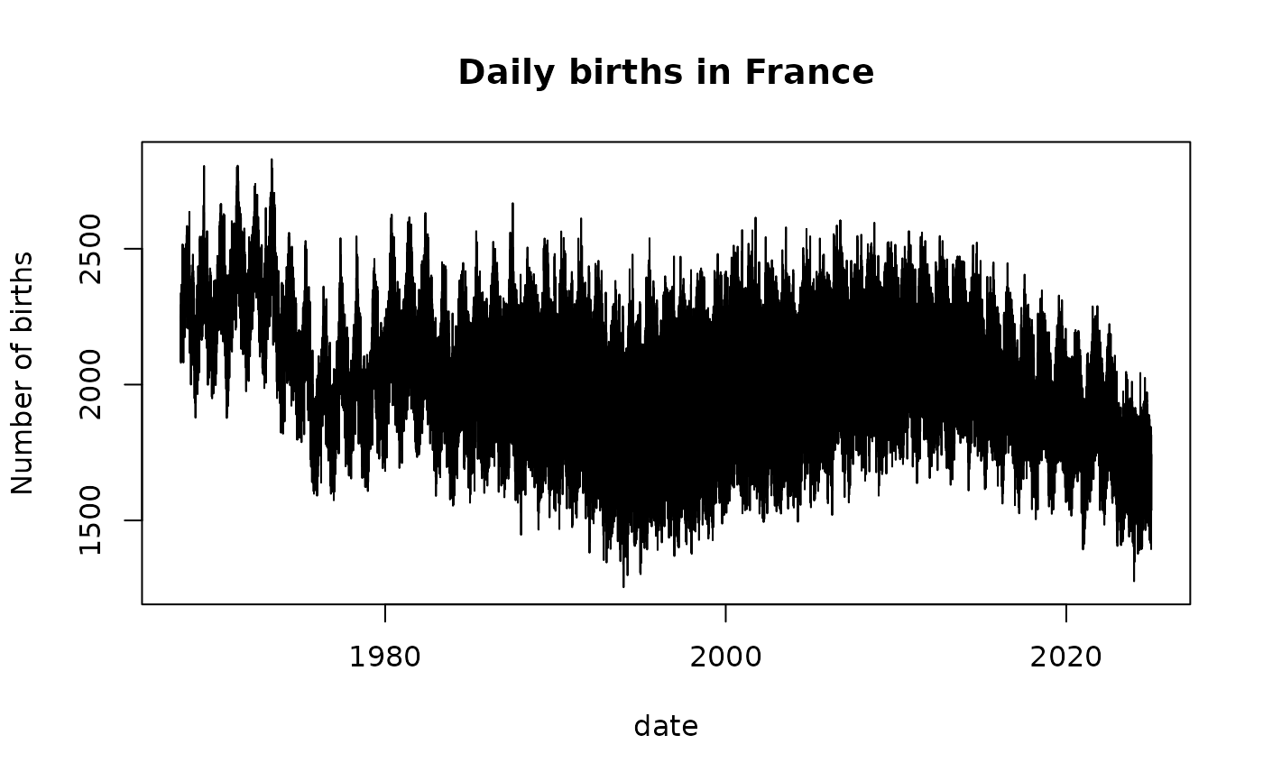 Daily number of births recorded in France (metropolitan + DOM), covering the period from January 1, 1968 to December 31, 2024.